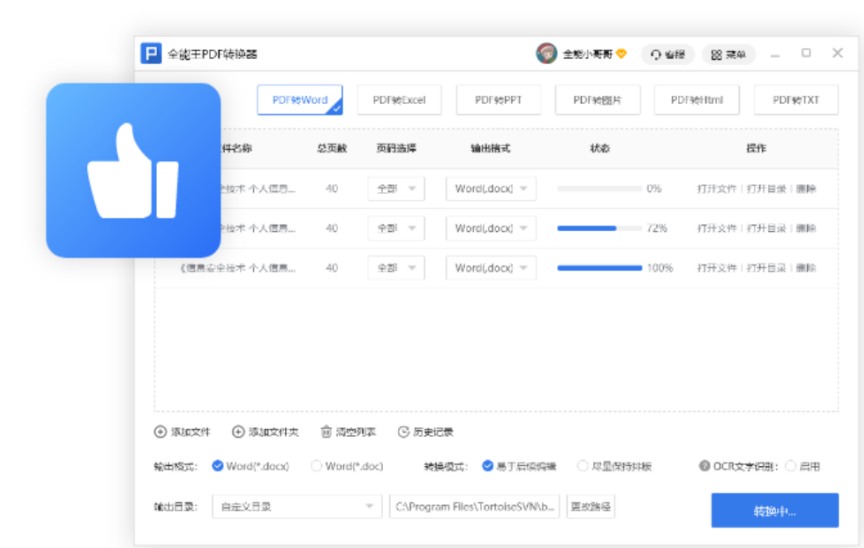 全能王pdf转换器是一款免费的转换器软件,它可以直接将word文档转化成为pdf文档。它的操作方法非常简单,只需要将需要转化的文件导入进去,然后点击word转化为pdf的选项,就可以进行相应的转化。转化完成之后,直接导出文件,就可以传输给其他人了。同时,如果想要锁定pdf文档中的内容,或者是对文档进行加密,也可以直接通过全能王pdf转换器进行操作。