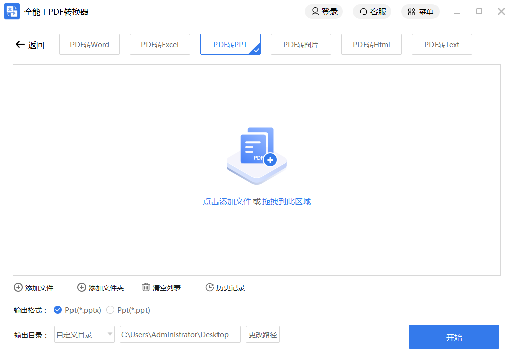 然后,点击PPT转PDF图标,进入文档上传页面,将需要转换的PPT文件添加到转换窗口;
