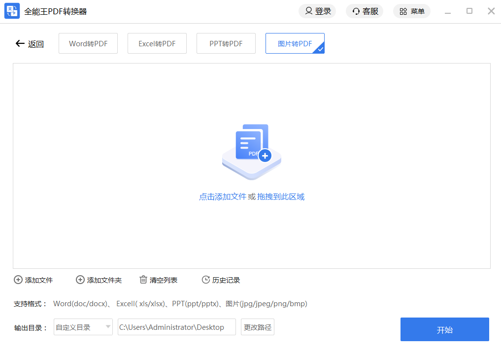 首先下载一个全能王PDF转换器,安装后打开,点击页面上的[Image 转换PDF],根据新页面提示导入图片(按住Ctrl键多选),设置导入后的[保存格式]和[保存路径],点击[开始]完成格式转换。