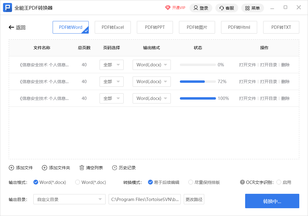 文件转换完成,在右侧的“状态栏”可以打开查看Word文件或是在“输出目录”打开Word文件。