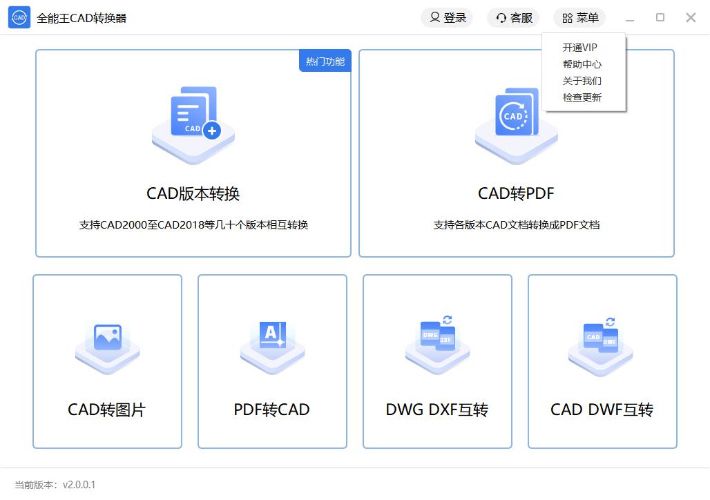 全能王CAD转换器是一款专业高效的CAD转换工具。全能王CAD转换器操作简便,功能齐全,不止可以进行PDF转CAD的操作,还支持cad文件各个版本之间的转换以及CAD转图片,PDF转CAD,CAD与DWF之间相互转换等等功能。小编最喜欢的就是它可以一键批量转换,方便快捷。